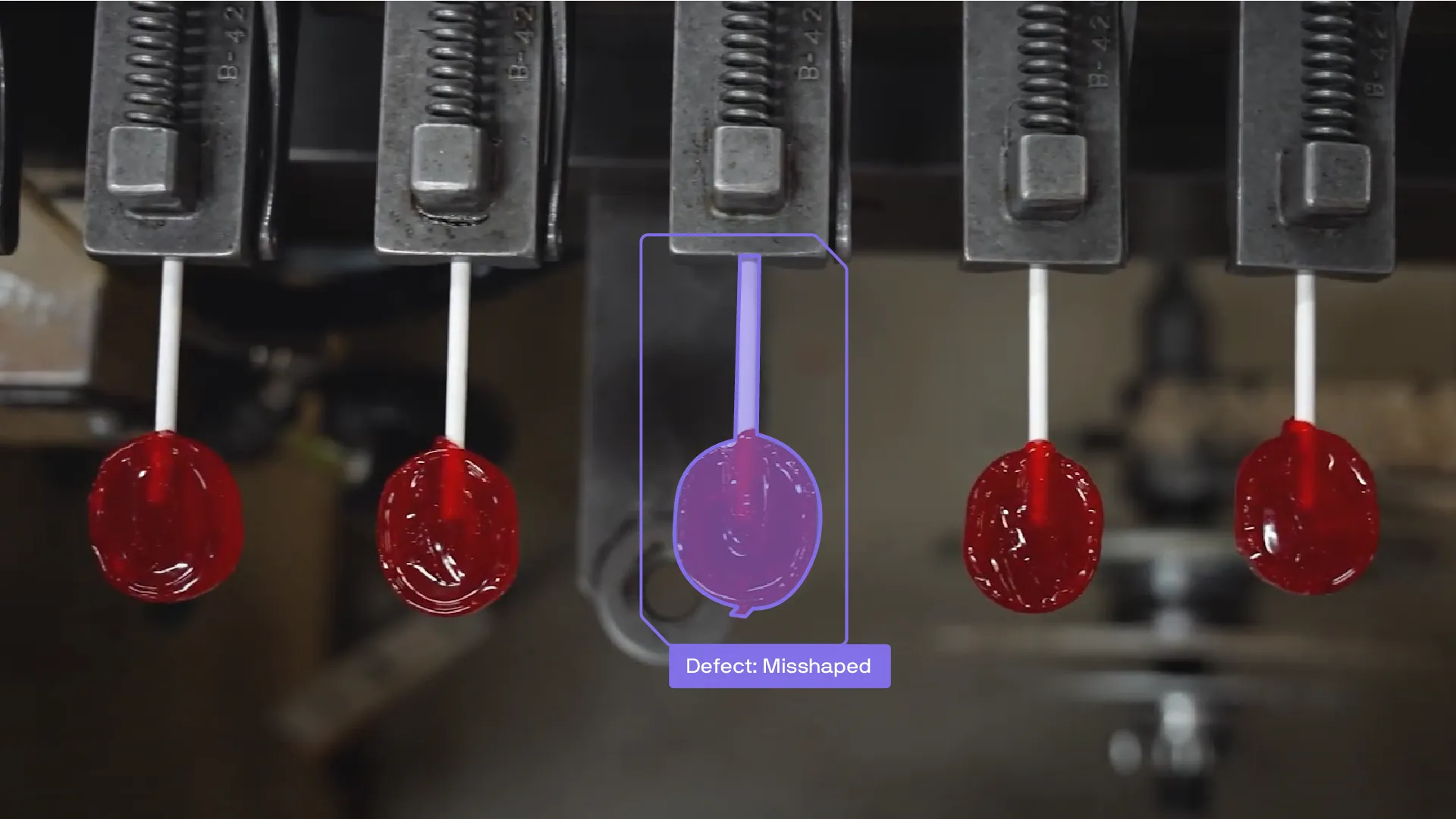 Maneva installed a detection system to oversee the high-speed projection mechanism. The AI identifies defects such as bent sticks, multiple sticks clamped together, or improperly cooled candy in real time. The system’s rejection mechanism ensures defective lollipops are removed without halting production. This proactive approach reduces liability risks, including those tied to potential choking hazards.